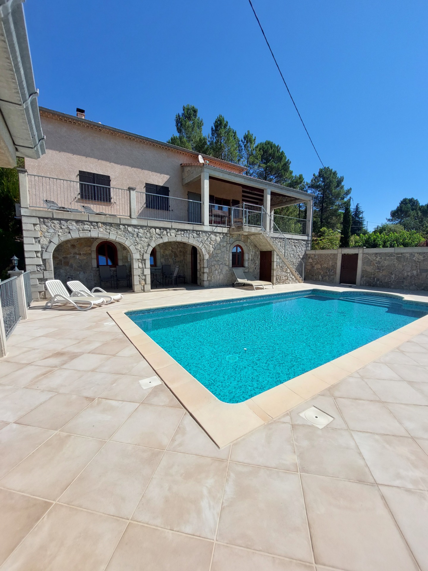 Er is grote en een kleine badkamer, een grote woonkamer met keuken, een fantastisch terras op de eerste verdieping, en extra schaduwterras bij het ingebouwde privé zwembad.